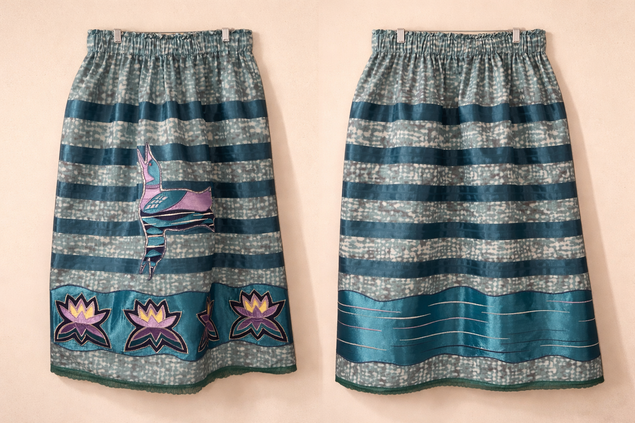 Wearable pieces made with intention-ribbon skirts, handbags, indigenized wear. Each piece is one of a kind.
